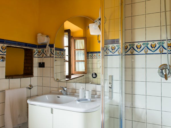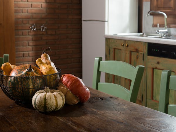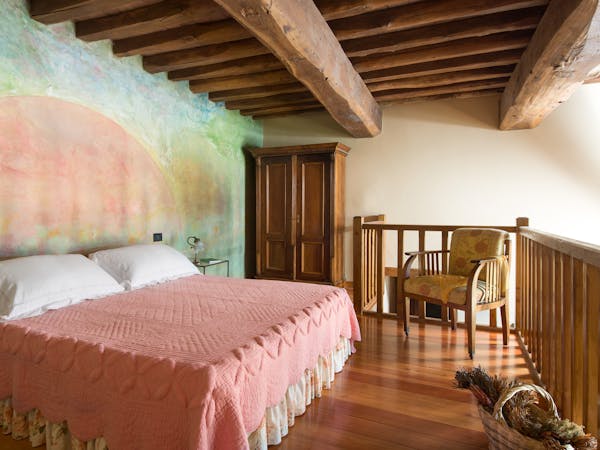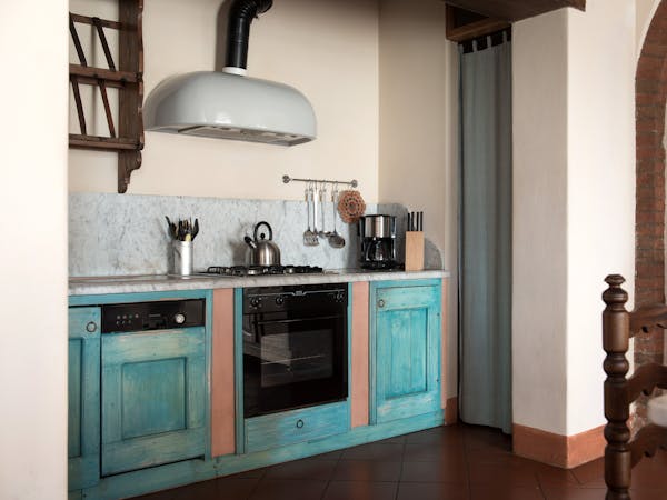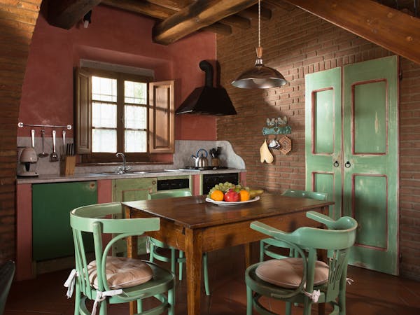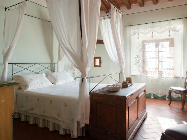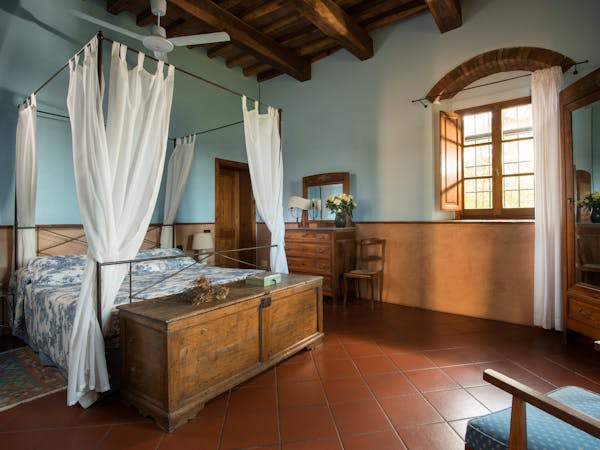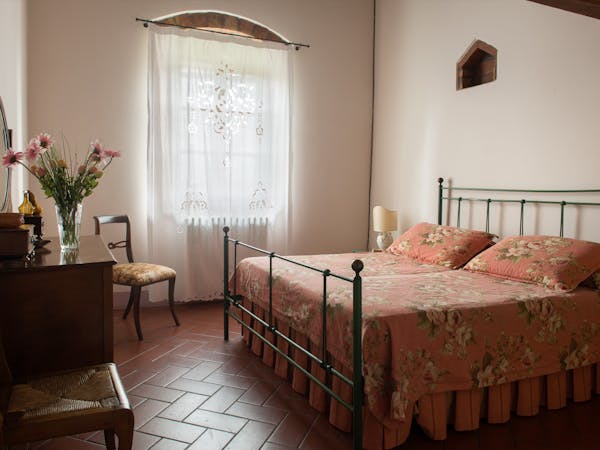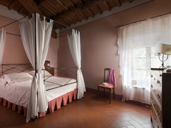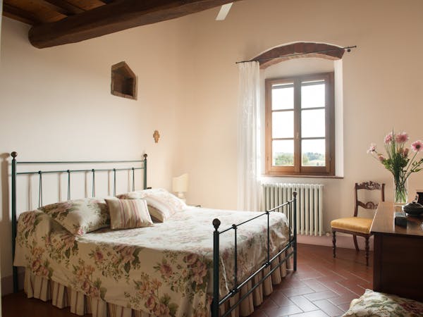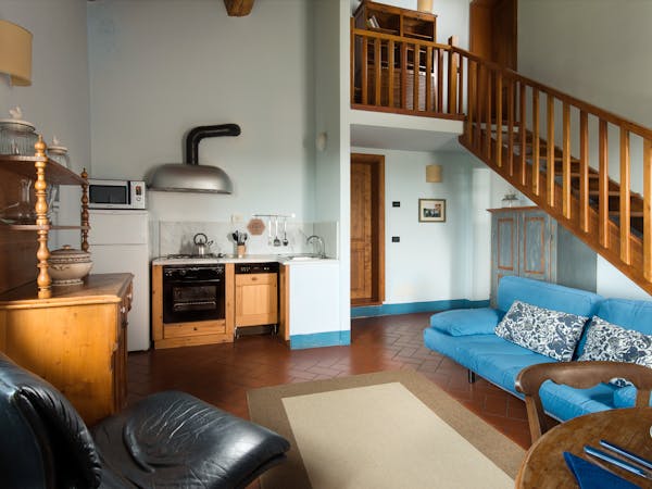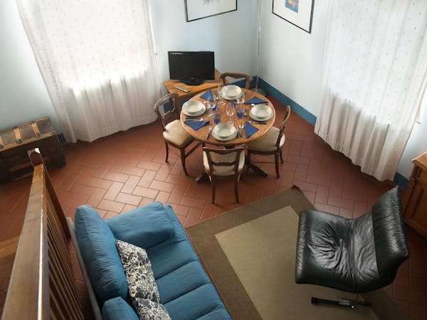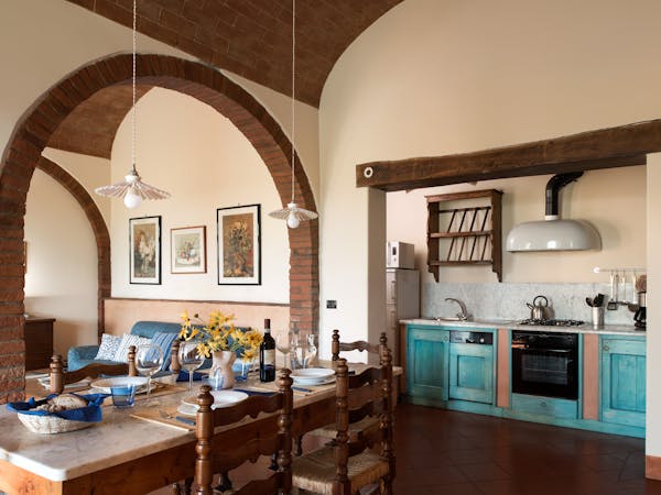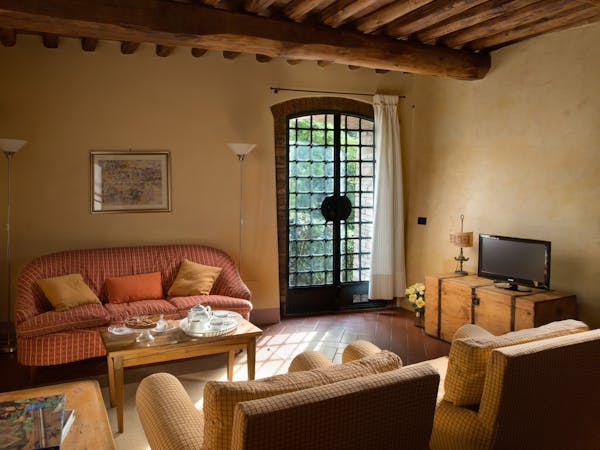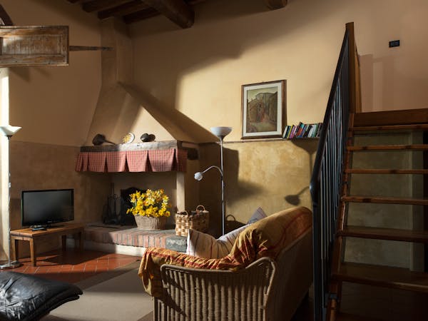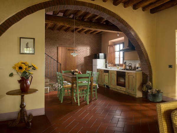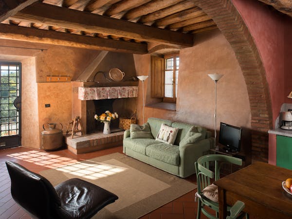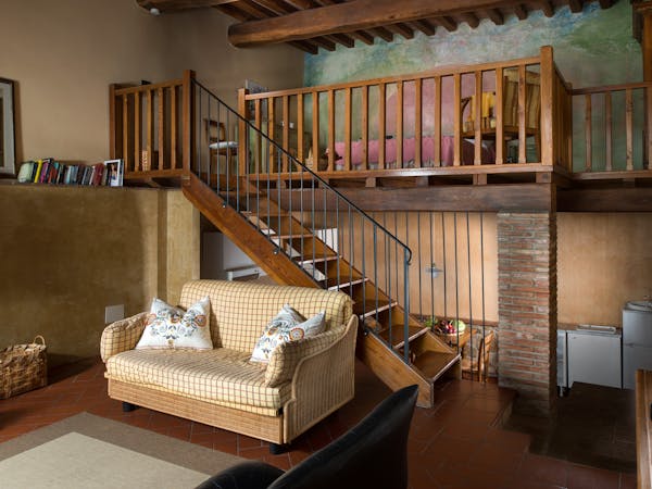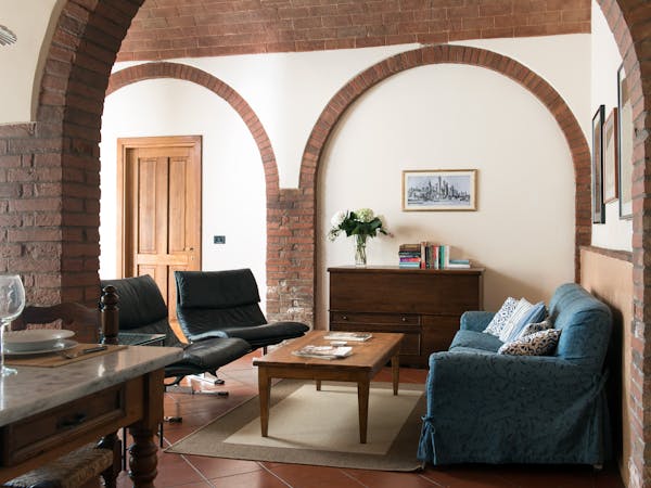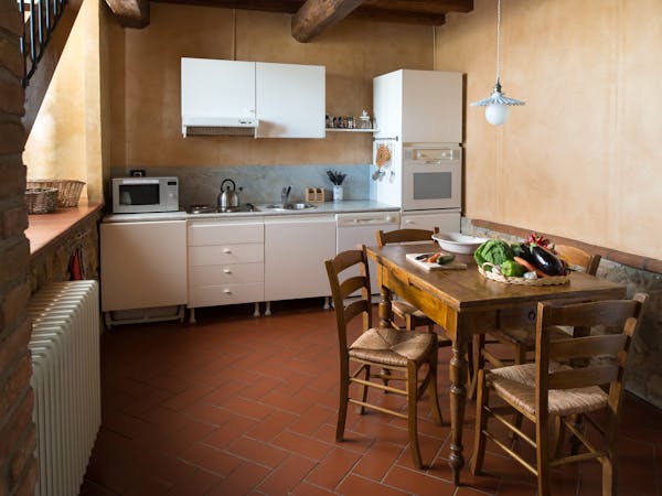 ETRUSCO - piano terra: ampio soggiorno con divano letto matrimoniale, cucina. Primo piano: ampia camera da letto (1 letto matrimoniale), bagno. Aria condizionata e ventilatore a soffitto. Mq 72 (2 + 2 persone). Panoramica con una meravigliosa vista su San Gimignano. Molto bella