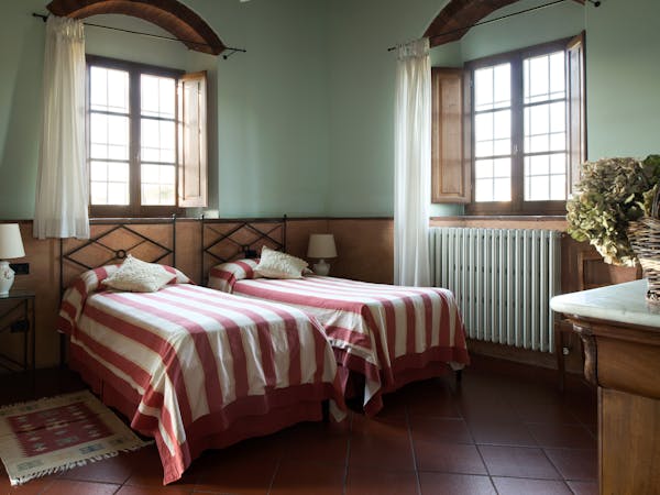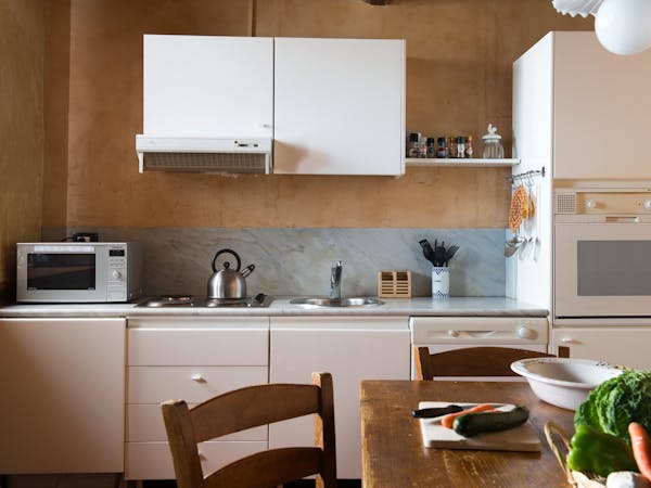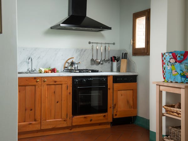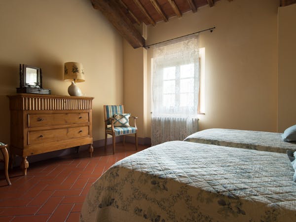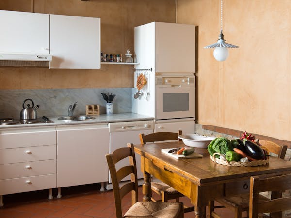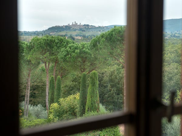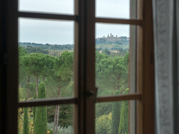 LA VEDUTA- tutto piano primo: soggiorno, cucina, 2 camere, 1 bagno. Aria condizionata e ventilatore a soffitto. , tot mq. 68 (persone 4). Molto panoramico, vista su San Gimignano.
